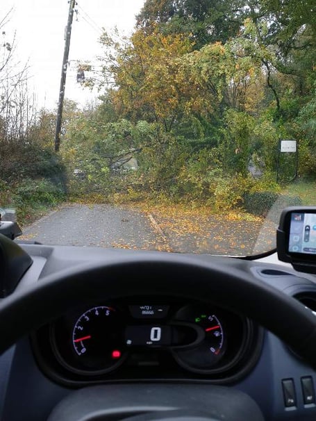 Both ways at Grove Meadow on the old A30 road from Okehampton into the village are completely blocked while Western Power make the road safe.