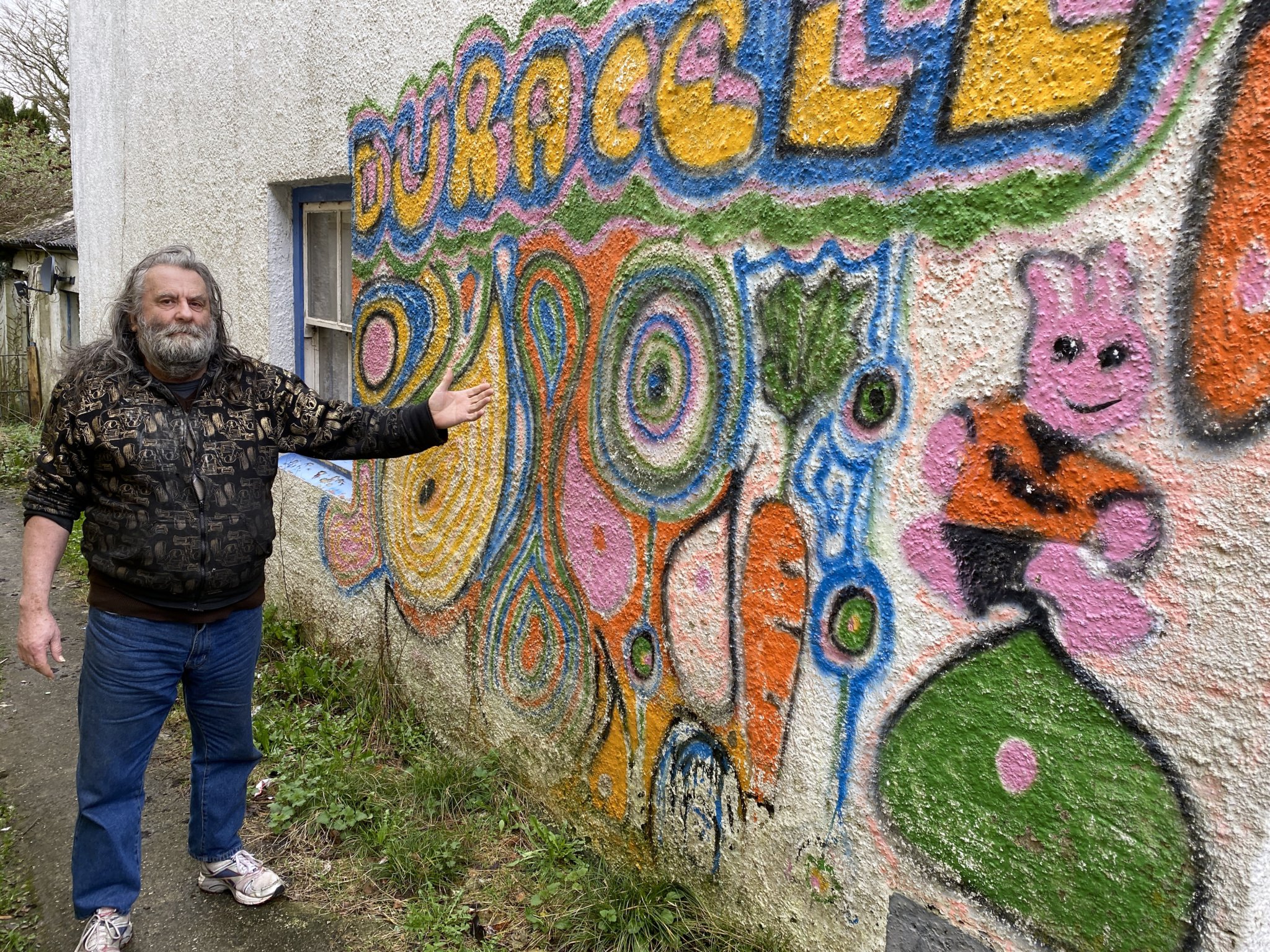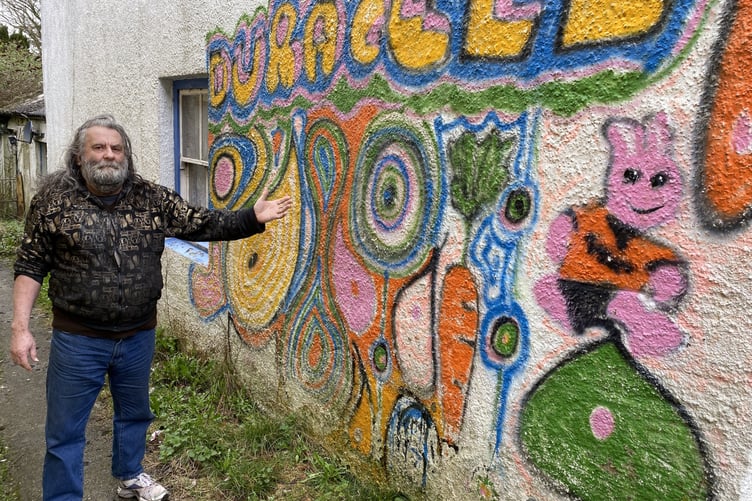 The artwork is in the style of graffiti on the side wall of the Fore Street house and former bookshop, opposite the Co-op and is about four by two metres, topped by the word Duracell in yellow lettering and includes the pink rabbit character in a superhero outfit.