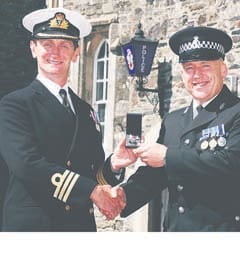PC Dave 'Jumper' Cross was awarded his 'operational service medal' by his former shipmate, Commander Malcolm Pollock from HMS Drake, for his service on Operation Veritas, which was established after the 9/11 terrorist attacks.