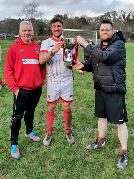 Pictured being presented with the cup is Ross Rovers captain Jack Jessop, centre, who also organised the day and is captain of the club’s U8s side. On his left is Rob Tremblett, manager of Ross Rovers and the Under 14s captain, and on his right is Matt Miller, Under 13s coach and manager of Matt-letico.