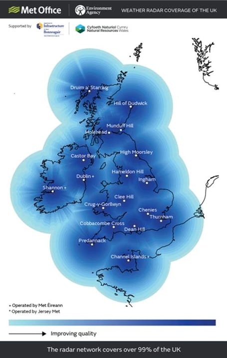 ‘Radar therefore provides a crucial input to short-range weather forecasts (nowcasts) of precipitation rate, and improves the skill of weather forecasts when it is assimilated into numerical weather prediction models.