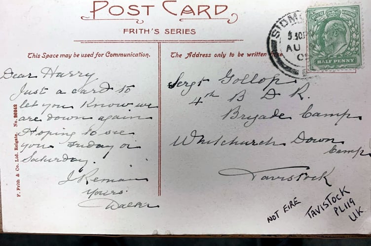 The Francis Frith’s Series postcard is numbered, which confirms the postmark year and is addressed to a Sergeant Harry Gollop then taking part in an Army (possibly the fourth Volunteer Battalion Devon Regiment) training camp at Brigade Camp on Whitchurch Down.
