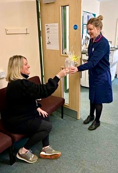 Kim Beattie, Livewell Southwest’s Interim Community Modern Matron for West Devon, surprised Gina Horsfield with the first mug full of treats for her passion for carrying out compassionate care.